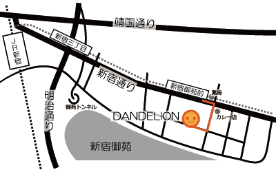 DANDELION[ダンデライオン] access: 東京メトロ 丸ノ内線 新宿御苑前駅から徒歩1分 JR 新宿駅から徒歩15分 address: 〒160-0022 東京都新宿区新宿1-4-12 シティ御苑ビルB館1F memo: 店舗でのギャラリー展示やグッズ販売等の委託ご依頼も受付中です。 詳しくは店頭にてお問い合わせ下さい。